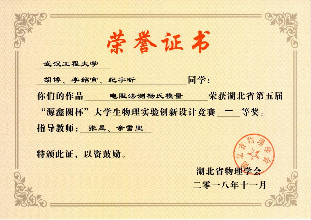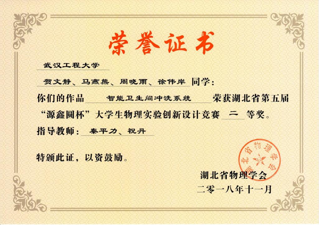 (本网讯 通讯员余雪里)10月26-28日,第五届湖北省老员工物理实验创新设计竞赛在湖北工业大学举行。经过两天的紧张赛事,公司学子再创辉煌成绩,在湖北的部属、省属共计33所高校760余名师生组成的323个代表队中脱颖而出,获得省一等奖一项,二等奖三项,三等奖三项,还获得了“湖北高校物理实验创新设计竞赛优秀组织奖”,所获奖项实现了公司历届奖项的历史性突破,充分展现了公司学子的实践创新能力更上新台阶。