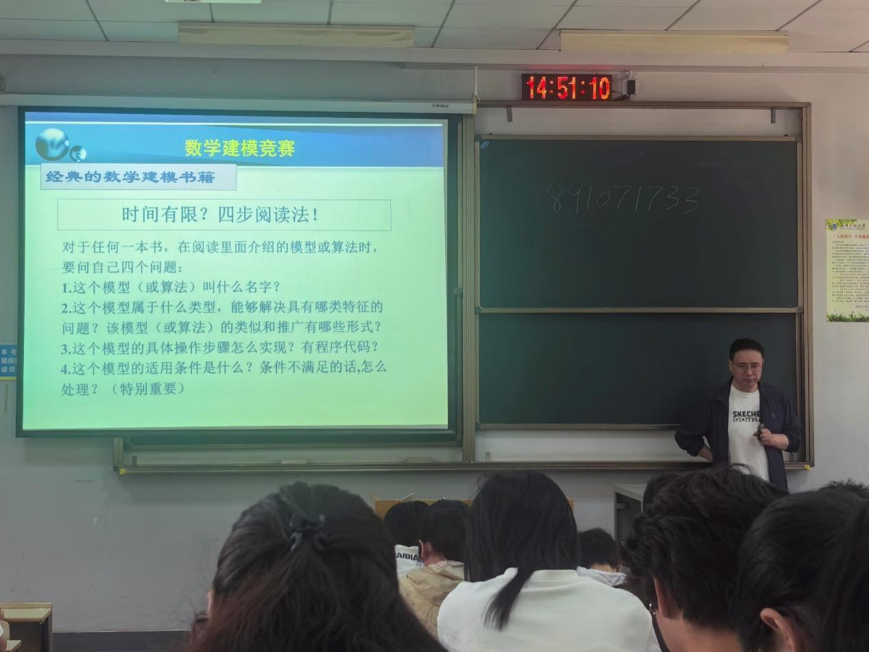 活动伊始,王炜老师凭借丰富的指导经验,深入浅出地介绍了数学建模竞赛的基本情况。他从竞赛的起源、发展历程讲起,详细阐述了竞赛的规则、评分标准以及在学术和实践中的重要意义,让同学们对数学建模竞赛有了全面且深入的认识。随后,王炜老师结合历年竞赛真题,着重强调了数学建模过程中模型建立、算法选择和论文撰写的关键要点,他通过具体案例分析,为同学们传授了实用的解题技巧和思路,帮助大家理清在竞赛中可能遇到的难点和重点。