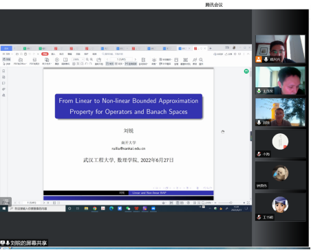 本网讯(通讯员:姚兴兴)6月27日下午,应光能三亿体育官网邀请,南开大学刘锐教授为公司师生做了题为《From linear to nonlinear bounded approximation property for operators and Banach spaces》的线上学术报告,学院部分教师和员工聆听了报告。