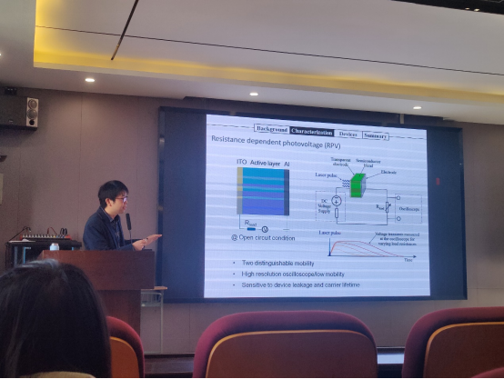 在讲座中,林教授主要以钙钛矿材料为例从光电性能、光电过程和器件设计三个方面来展开介绍,着重讲述了光电性能与光电过程,如何尽可能准确的研究光电过程中的物理量,比如载流子迁移率、载流子寿命等,如何使用电学测试、光学测试以及光电学结合测试的方法来研究。林老师还结合了自己课题组目前所做的一些研究工作及搭建的实验测试平台等对钙钛矿太阳能电池的研究展开了详细的讲述。