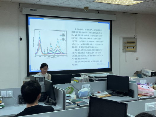 宋梦婷同学汇报主题为“拉曼光谱研究退火氧化镍中二阶磁振子散射增强”,高温退火处理可显著增强氧化镍中二阶磁振子散射,并显著减弱激光功率对氧化镍中二阶磁振子散射的影响。在450—1050℃范围内,退火温度越高,增强效应越明显。经过1050℃退火处理后,二阶磁振子散射增强效应可达两个数量级以上,该增强效应与高温退火处理后氧化镍样品中镍缺陷的显著减少紧密相关。经过1050℃退火处理的氧化镍样品仅有较弱的激光加热效应,其二阶磁振子散射在较高激光功率下仍非常显著。