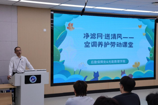 启动仪式明宗旨,专业授课传技能。活动伊始,后勤保障处副处长李义伟发表致辞,强调了此次活动对于校园环境维护和员工劳动素养培育的重要意义,鼓励同学们积极参与、认真学习,将理论知识与实践操作紧密结合。随后,后勤保障处的专业技术人员通过图文讲解、实物演示系统传授空调滤网清洗规范与安全要点。