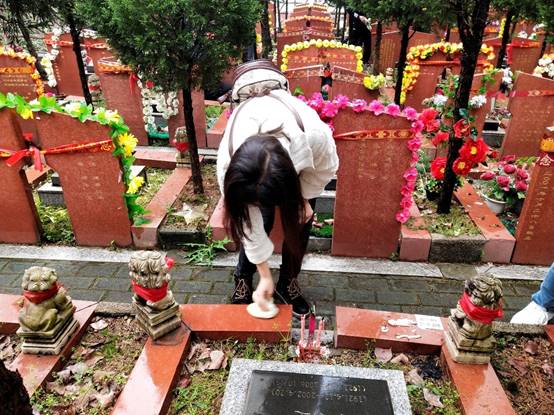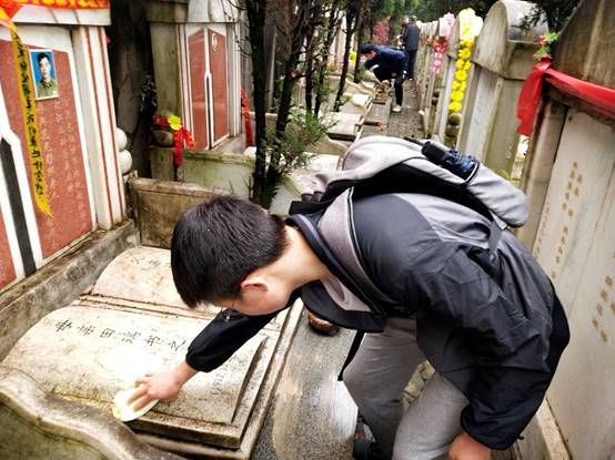 同学们自发为这些为了革命、为了国家埋骨异乡,叶落未归根的烈士们清洗烈士墓碑,为他们拂去落叶,擦去尘土,让烈士们纵使葬于异乡,也能安心长眠。