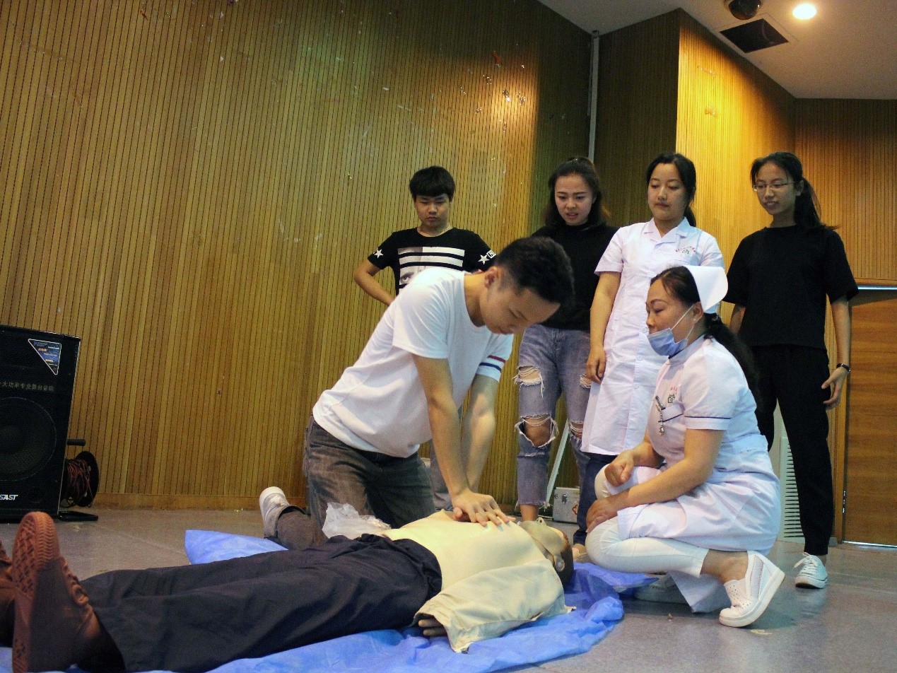 接下来,刘医生重点介绍了心肺复苏术的操作规范和注意事项。她从认识掌握心肺复苏术的重要性,心肺复苏术概念、实施条件、心脏按压的作用,到实施心肺复苏术的六个操作步骤(判断意识、高声呼救、救护体位、胸外按压、畅通气道和人工呼吸)进行了详细讲解,现场校医院护士做了心肺复苏模拟示范,部分师生还亲自体验了心肺复苏的实践操作。