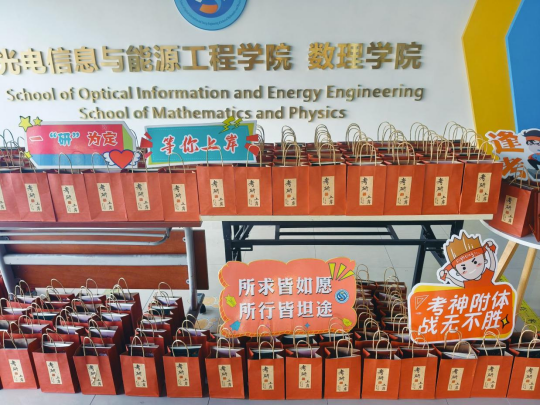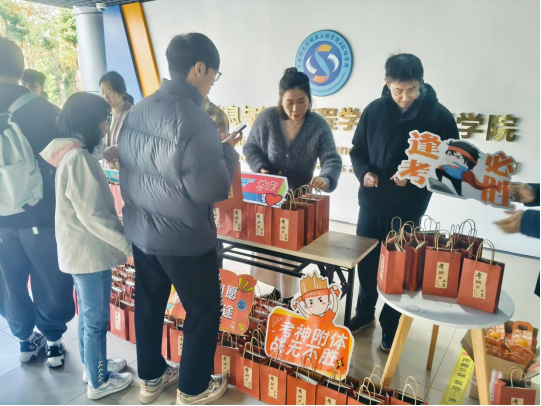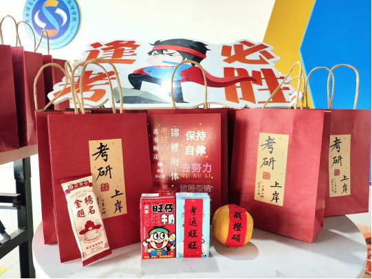 公司提前为考研学子定制了寓意满满的“考研上岸”加油大礼包,每一份大礼包都饱含着对考研学子们的热切关怀和殷切希望。包括橙子、旺仔牛奶、棒棒糖、笔记本等食物、文具用品,寓意考研学子定能考运“旺旺”、金“棒”题名、“本”赴前程、“橙”功上岸,不仅寓意吉利,还能帮助同学们补充营养,保持状态。收到礼物后,同学们纷纷表示感受到了学院的关心和祝福,将在最后冲刺保持良好的心态,以积极乐观的态度去迎接即将到来的挑战。