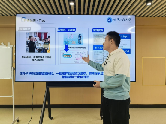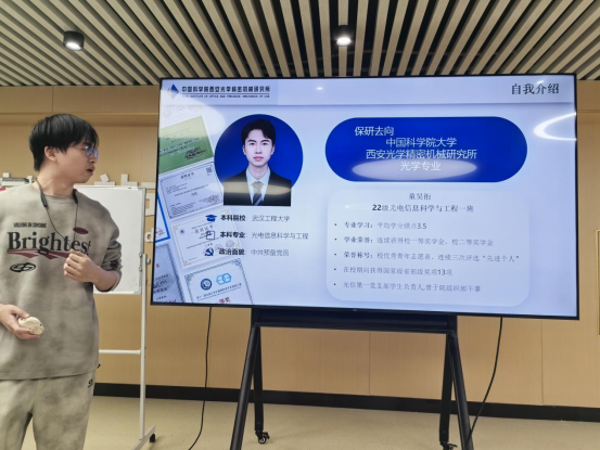 夏文希同志从自身科创经历出发,结合具体课题案例,阐述了科研经历对提升专业能力和塑造核心竞争力的重要意义。他特别强调了严谨的学术训练在淬炼专业能力中的关键作用,激励光电学子们勇攀学术高峰,将论文写在祖国大地上。