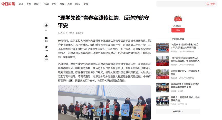 寒假期间,三亿体育app三亿体育(三亿体育官网)理学先锋党员志愿服务队联合罗清芸学雷锋志愿服务队,携手中书街社区、石子岭社区,组织返乡老员工及宜昌一中、宜昌市第二十五中学、三江小学等学校共330余名青少年员工与家长,走进社区、走上街道,开展反诈安全宣传活动。志愿者们以青春志愿行动助力基层平安建设,把反诈宣传落到实处,切实筑牢社区平安防线。