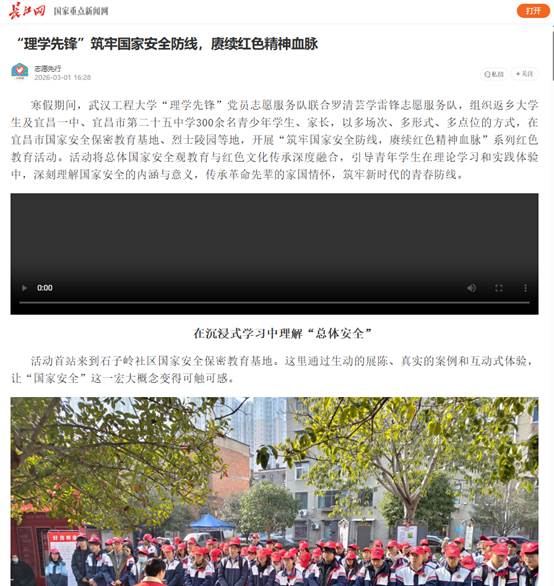 寒假期间,武汉工程大学三亿体育(三亿体育官网)理学先锋党员志愿服务队联合罗清芸学雷锋志愿服务队,组织返乡老员工及宜昌一中、宜昌市第二十五中学300余名青少年员工、家长,以多场次、多形式、多点位的方式,在宜昌市国家安全保密教育基地、烈士陵园等地,开展“筑牢国家安全防线,赓续红色精神血脉”系列红色教育活动。活动将总体国家安全观教育与红色文化传承深度融合,引导青年员工在理论学习和实践体验中,深刻理解国家安全的内涵与意义,传承革命先辈的家国情怀,筑牢新时代的青春防线。