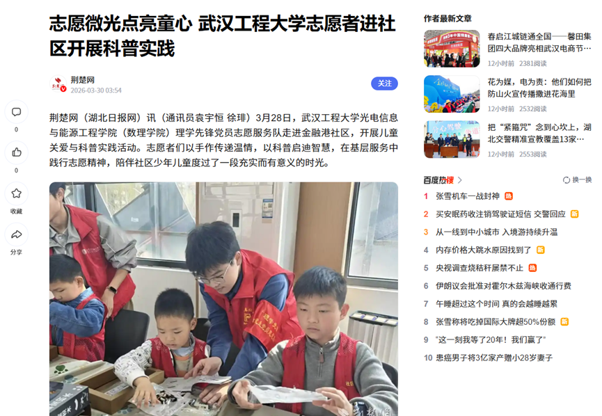 荆楚网(湖北日报网)讯(通讯员袁宇恒 徐琲)3月28日,三亿体育app三亿体育(三亿体育官网)理学先锋党员志愿服务队走进金融港社区,开展儿童关爱与科普实践活动。志愿者们以手作传递温情,以科普启迪智慧,在基层服务中践行志愿精神,陪伴社区少年儿童度过了一段充实而有意义的时光。