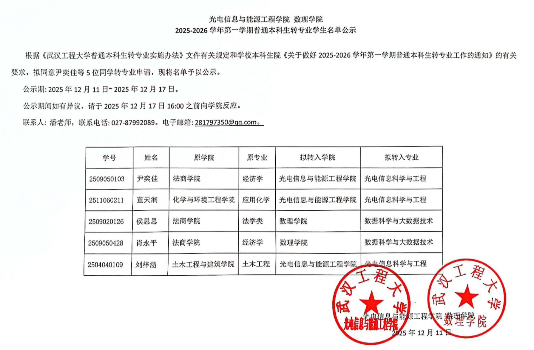 三亿体育 三亿体育官网2025-2026学年第一学期普通本科生转专业员工名单公示