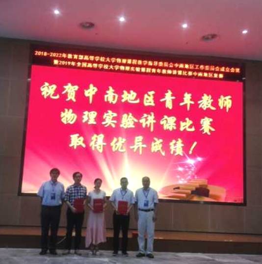 本网讯(通讯员 余雪里)6月21至23日,2018-2022年教育部高等学校大学物理教学指导委员会中南地区工作委员会成立会议暨2019年中南地区青年教师讲课比赛在华中科技大学成功举办。经过激烈的角逐,公司三亿体育官网大学物理实验中心青年教师秦平力老师以扎实的教学基本功、丰富的教学形式和精彩的问答展示,力压众多“双一流”高校参赛选手,荣获比赛一等奖。