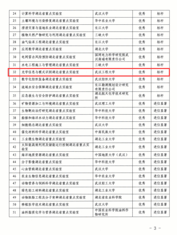 本网讯(通讯员 王蓓)近日,省科技厅公布了关于2021年度省重点实验室绩效考核结果的通知。其中,“优秀”省重点实验室共57家,包括省重点实验室建设标杆35家、省重点实验室考核进位显著22家;“合格”省重点实验室共116家。光学信息与模式识别湖北省重点实验室在评估中获优秀(标杆)。