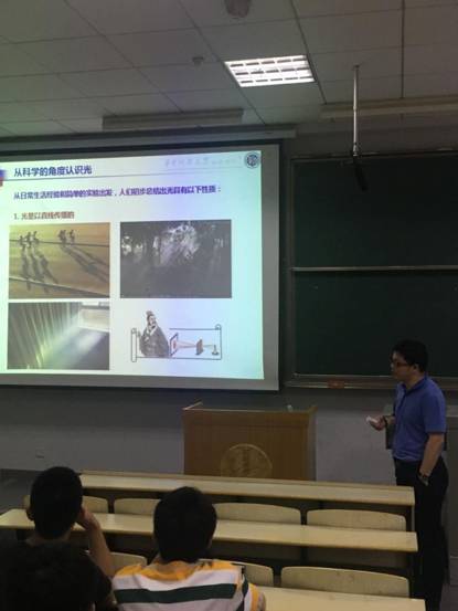 报告会中,王兵教授首先介绍了物理学院的团队队伍以及自己所在的科研团队情况;随后,为师生们介绍了人们对光的科学认识的发展,光学虽然是一门古老的学科,但科学家们对光的本质却依然在争论;其次,报告介绍了纳米光子学的研究背景、应用意义以及纳米尺度下新奇的光学现象,包括光子晶体、表面等离激元和人工超材料。