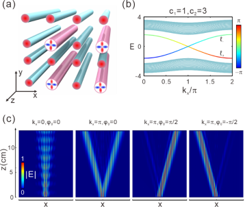 图1 (a)基于光波导的莫比乌斯拓扑绝缘体示意图。(b)能带结构。(c)拓扑边界态的定向激发。