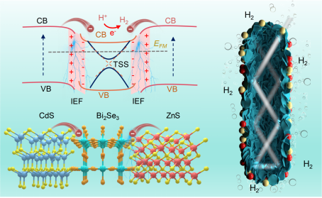 本论文报道了一种将CdS和ZnS生长在拓扑绝缘体Bi2Se3上的纳米管CdS/ZnS/ Bi2Se3,并首次应用于高效光催化产氢。在该三元体系里,Bi2Se3独特的TSS(拓扑表面态)可以提供强的局域电场和长寿命的电荷载流子,同时经过加热形成的独特中空结构增强了光的散射,从而进一步提高其光捕获能力,随着具有窄带隙的CdS和ZnS加入,使得在该体系内形成了多通道电子转移路径,大大延长了载流子的寿命,抑制了电荷复合,同时三者的强耦合带来的带隙与TSS激发使得在紫外到可见光范围内表现出高效和宽范围的光吸收,因此在模拟太阳光下,该CdS/ZnS/ Bi2Se3纳米管的光催化速率可达7.13 mmol h-1 g-1,是纯CdS的69.2倍。本工作得到了国家自然科学基金、湖北省自然科学基金、武汉曙光工程知识创新计划、三亿体育app光学信息与模式识别湖北省重点实验室的资助。(审稿 陈相柏 史红杰 廖青)