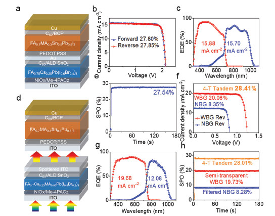 多年来,秦平力教授致力多价态金属阳离子光学功能薄膜材料与光伏器件领域的相关研究。2024年,秦平力教授及其所在科研团队成员与武汉大学、华中科技大学开展广泛合作,将全氟磺酸离子交联聚合物溶于聚(3,4-乙烯)二氧噻吩(PEDOT)的醇溶液中,提高其溶解性。同时,将氯化乙酰胆碱直接浸入PEDOT:PSS,以“潜水员”身份活化Sn-Pb钙钛矿的埋藏界面,调节底部的PEDOT: PSS空穴传输层,促进埋藏界面的重建,减少埋底界面缺陷,提高顶部钙钛矿层的质量,实现高效的双端和四端叠层钙钛矿电池分别为27.54%(认证为26.41%)和28.01%,相关成果发表在Advanced Materials,Advanced Functional Materials,Journal of Energy Chemistry等国际顶级期刊上。