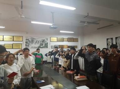 随后,曾颖书记为每位党员授牌。授牌仪式结束后,青年党员代表言久兴带领所有党员重温了入党誓词,现场气氛肃穆庄重,给每位同学都起到了良好的教育启示作用。