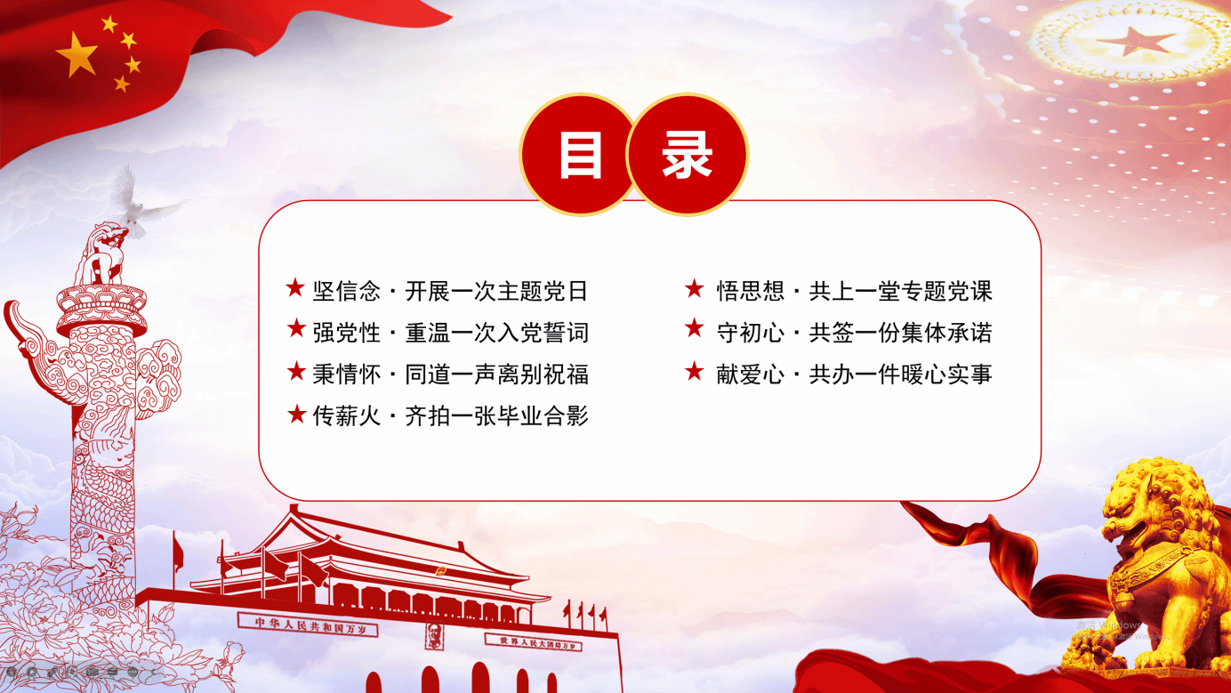 “七个一”系列教育活动,包括:(一)坚信念,开展一次主题党日;(二)悟思想,共上一堂专题党课;(三)强党性,重温一次入党誓词;(四)守初心,共签一份集体承诺;(五)秉情怀,同道一声离别祝福;(六)献爱心,共办一件暖心实事;(七)传薪火,齐拍一张毕业合影。