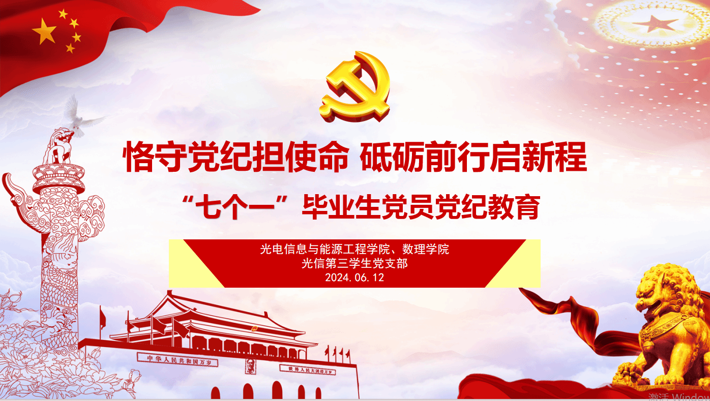 6月12中午,光信第三员工党支部开展“恪守党纪担使命 砥砺前行启新程”主题党日活动。活动在庄严肃穆的国歌声中拉开帷幕,全体党员由支部书记王乐凯领誓,在党旗下重温入党誓词,以铿锵誓言铭刻入党初心,坚定理想信念。之后,王乐凯以“以纪修身守初心使命 知行合一做理学先锋”为题,为全体支部党员上毕业前最后一次党课,带领全体党员学习《中国共产党纪律处分条例》。结合新修订的条文内容青年党员要清楚自身容易犯的错、青年党员要牢记纪律规矩划的线、青年党员要敬畏违纪违法酿的果三方面展开,引导员工认识到纪律是青春的“紧箍咒”,更是成长的“护身符”真正做到言有所戒、行有所止、心有所畏。
