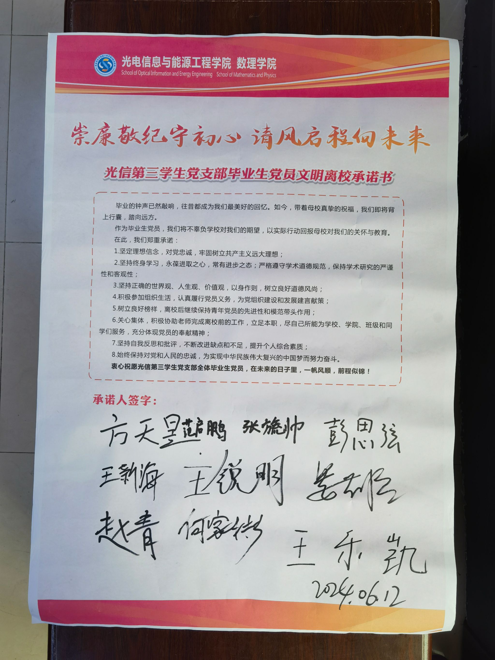 支部全体毕业生党员依次《光信第三员工党支部毕业生党员文明离校承诺书》上签名