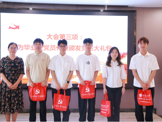 学院专职组织员欧阳琼为毕业生党员代表发放“党员大礼包”,勉励毕业生党员们永葆初心、勇担使命,以青春之我、奋斗之我谱写时代华章。